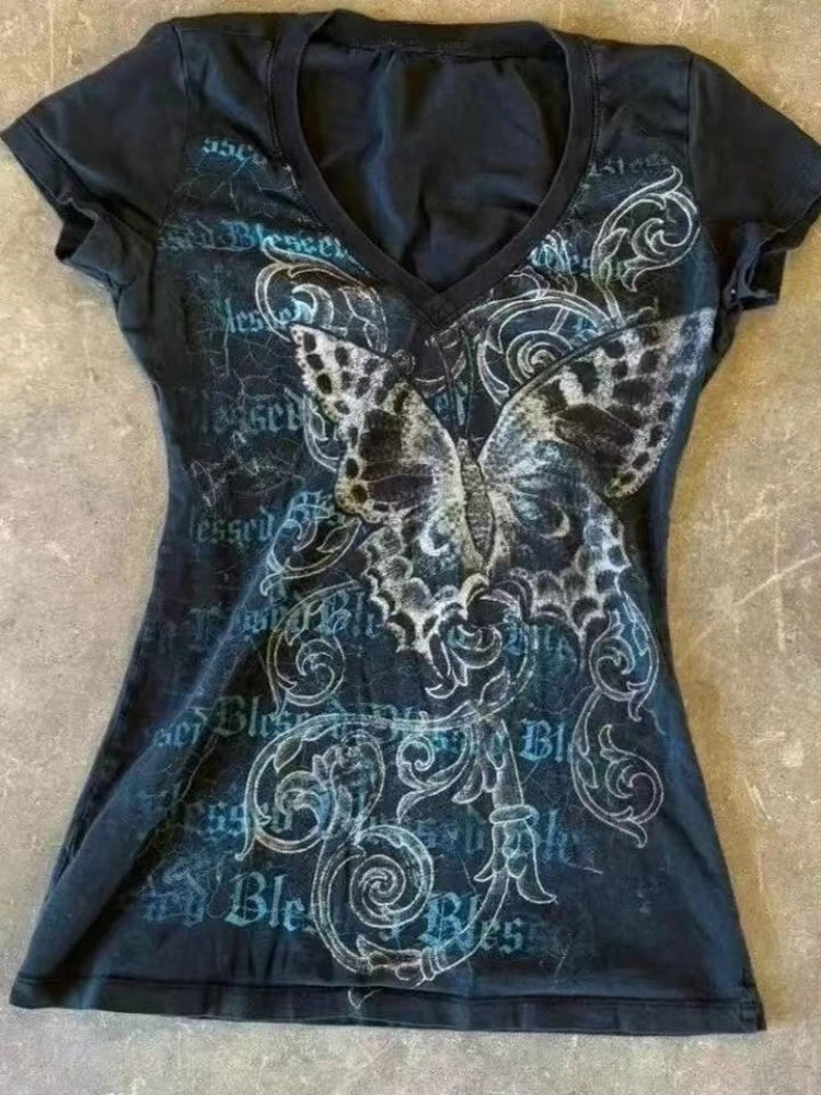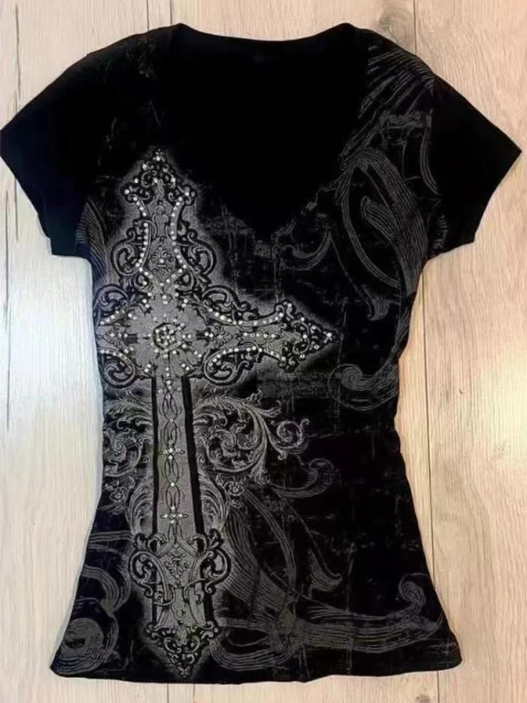 2025 Punk Gothic Grunge T-shirt Vintage Print Short Sleeve Women's Emo Tops Y2K Emo Aesthetic Sexy Streetwear Tees Casual New